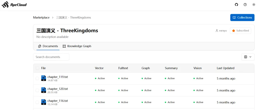 Visit ApeRAG at https://rag.apecloud.com/ , register/login, and select or import a knowledge base. Here we use the Romance of the Three Kingdoms example - click subscribe.