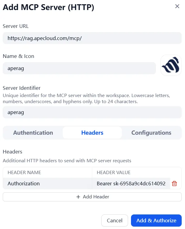 https://rag.apecloud.com/mcp/ and your API Key copied from ApeRAG, then click Confirm.