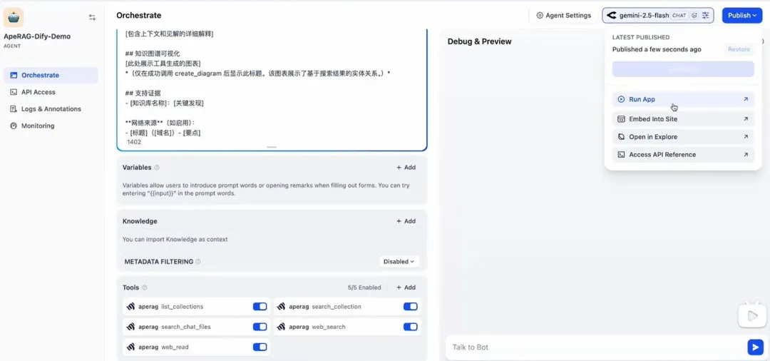 Integrating ApeRAG with Dify is very simple. Once integrated, you can not only experience Dify's platform features but also enjoy ApeRAG's powerful Graph-RAG capabilities!